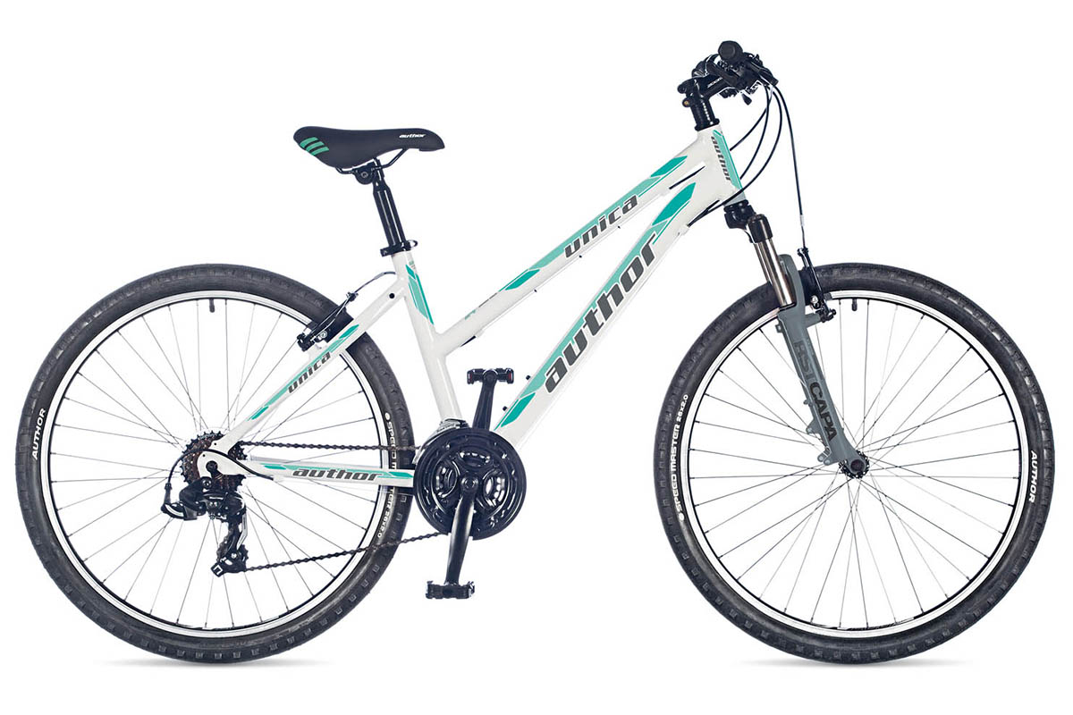 Author Unica - недорогой прогулочный горный велосипед с низкой рамой на 26-дюймовых колесах, оснащенный алюминиевой рамой и амортизационной вилкой.
